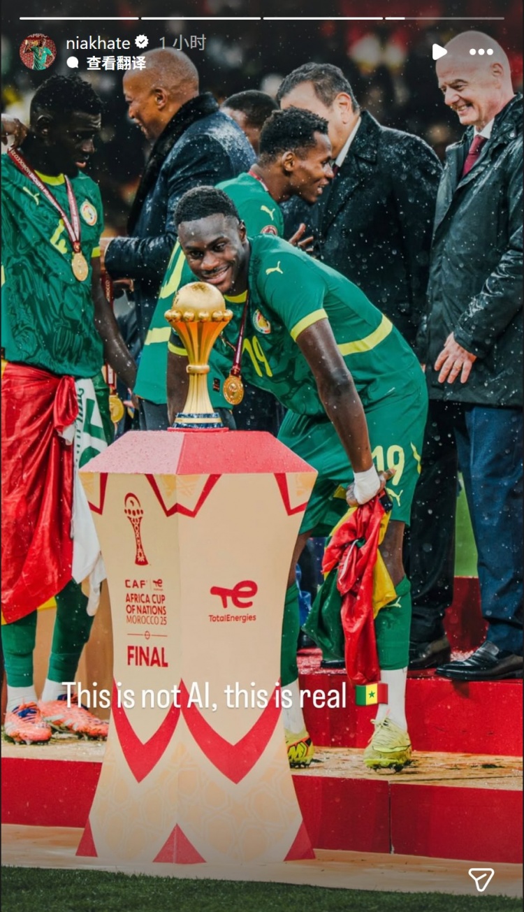 抗议!塞内加尔后卫尼亚卡特晒颁奖仪式照片:这不是AI,而是现实 3月18日讯 非洲足联官方宣布,裁定非洲杯决赛塞内加尔弃赛,结果改为摩洛哥3-0取胜,塞内加尔的冠军被剥夺。塞内加尔中卫尼亚卡特社媒晒出非洲杯决赛颁奖仪式的 2026/03/18