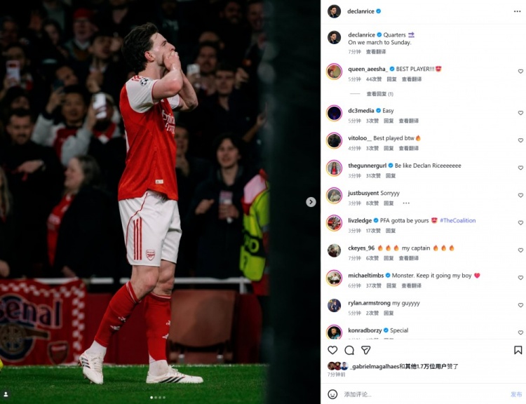 当选全场最佳!赖斯社媒晒庆祝进球照片:晋级8强! 3月18日讯 在欧冠淘汰赛次回合,阿森纳2-0击败勒沃库森晋级。本场比赛赖斯发挥出色,打进精彩进球,赛后也当选官方全场最佳球员。赖斯在社媒晒出庆祝进球照片,配 2026/03/18